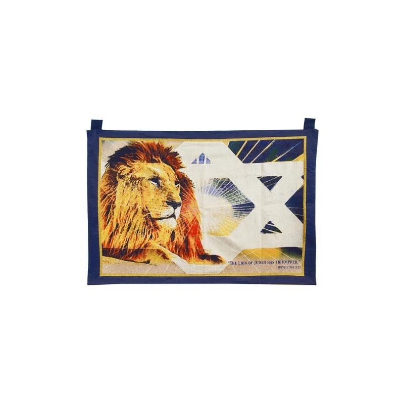 Featuring the Lion of Judah interposed on white Star of David, all on a blue background. Scripture is Revelation 5:5 "The Lion of Judah has triumphed." Dimensions are 27"L x 42"W