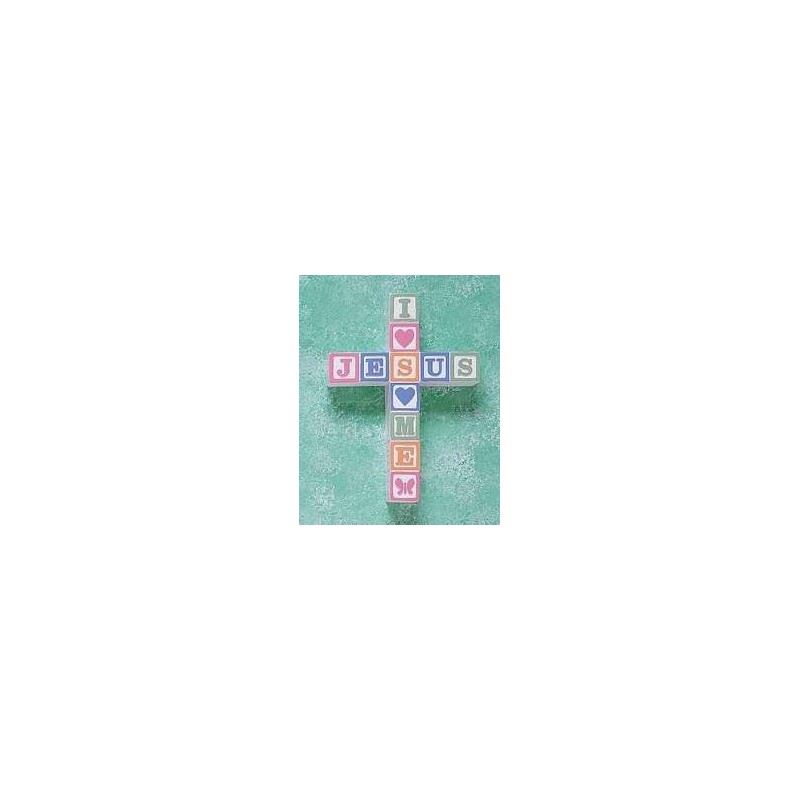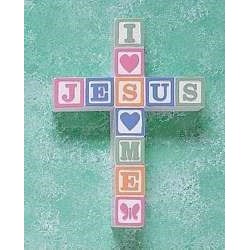 I Love Jesus ABC Block Wall Cross--Pastel This children's cross is made of resin with raised block motif and is hand painted in pastel colors. It comes ready to hang. The cross measures 6 1/4" x 8 3/4".