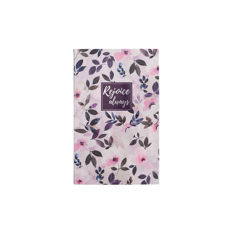 This Rejoice Always Christian journal has a printed heavy card stock cover with high glossy texture and silver foiled title. It contains 128 lines pages for journaling or note-taking with a Scripture verse at the bottom of each page. A presentation page was added at the front of the journal for a personal message when giving as a gift. Size: 5 1/8" (W) x 8 1/4" (H) Glossy Card Stock Cover Foiled Title 128 Lined Pages Presentation Page for Gift-giving